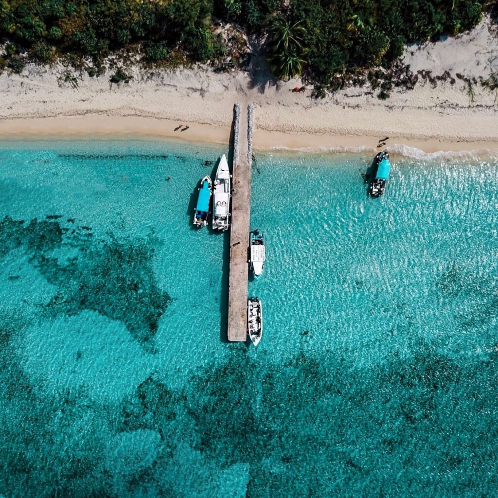 Cruza el mar turquesa hasta la isla y sobrevuela el muelle de cruceros